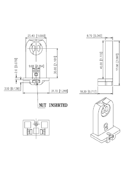 * Fluorescent bi-pin socket, long model, screw and nut surface mounting (nut inserted)